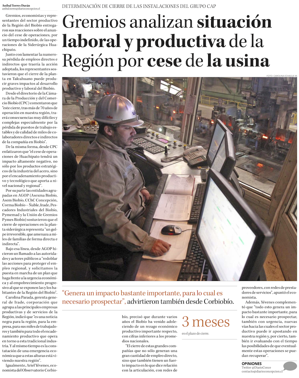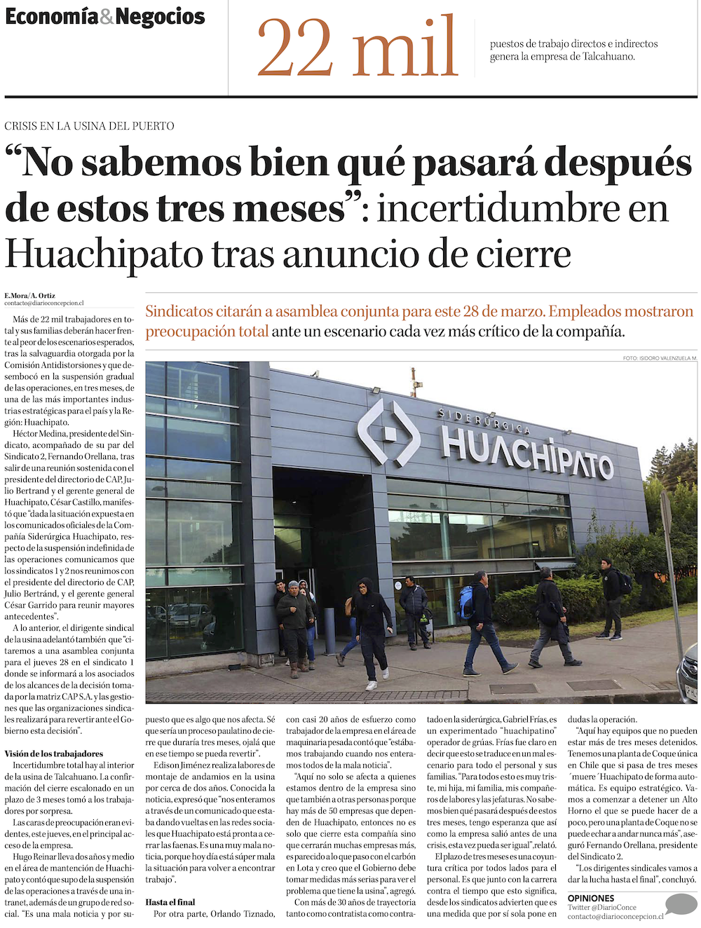 CAP anuncia cierre de Huachipato, pero lo condiciona a acciones que tome el Gobierno - (El Mercurio de Santiago)