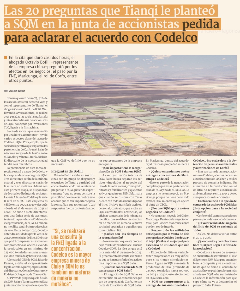 La junta de SQM por alianza con Codelco: AFP Provida pidió que los accionistas voten el acuerdo y Tianqi monopoliza las preguntas - (Pulso)