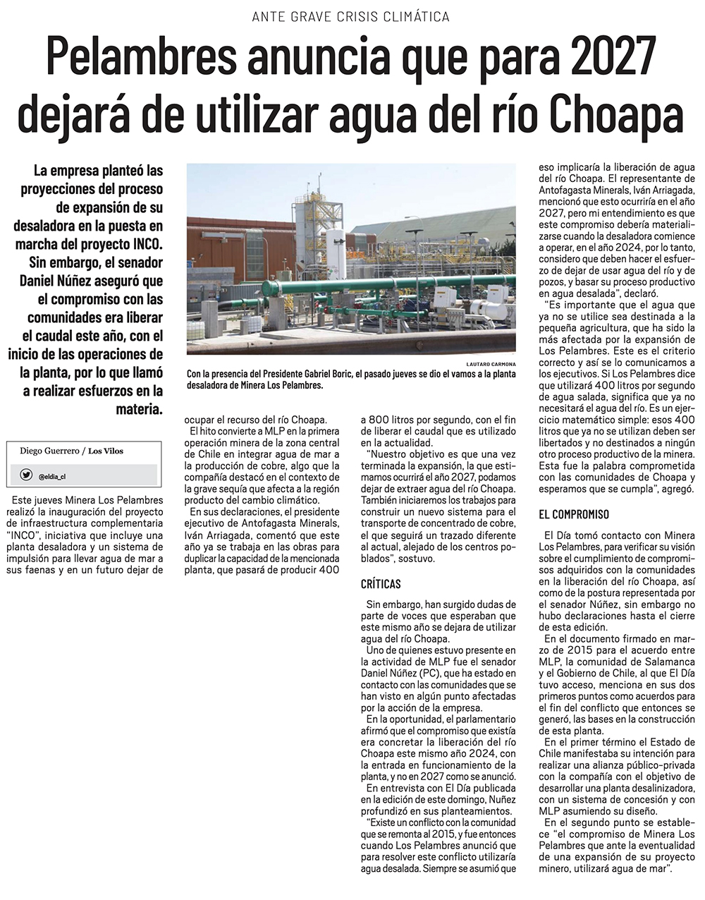 MLP dispone caudal de 130 l/s adicionales para proyector hídricos en la provincia del Choapa - (Semanario Tiempo)