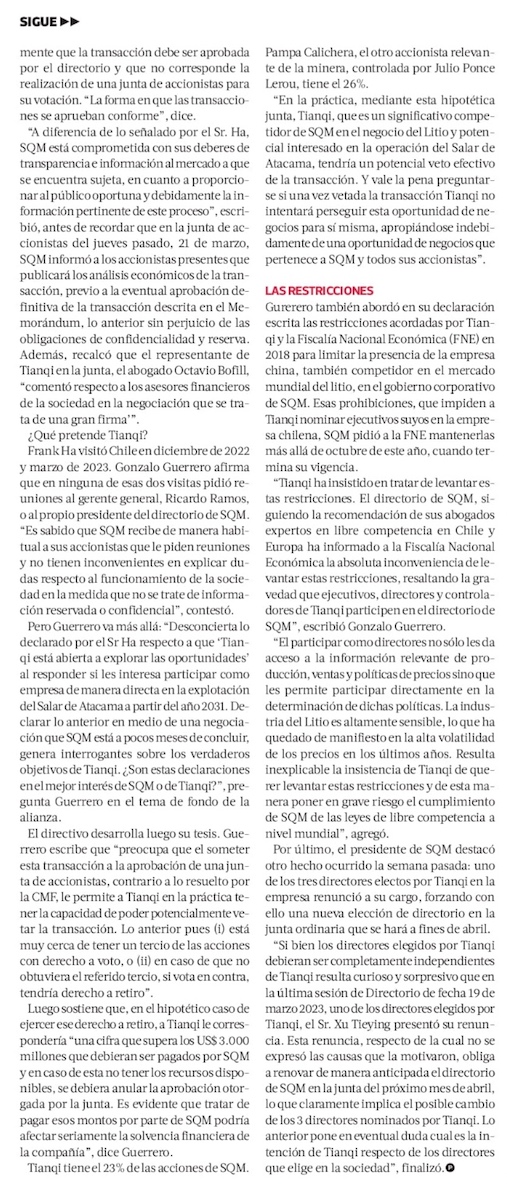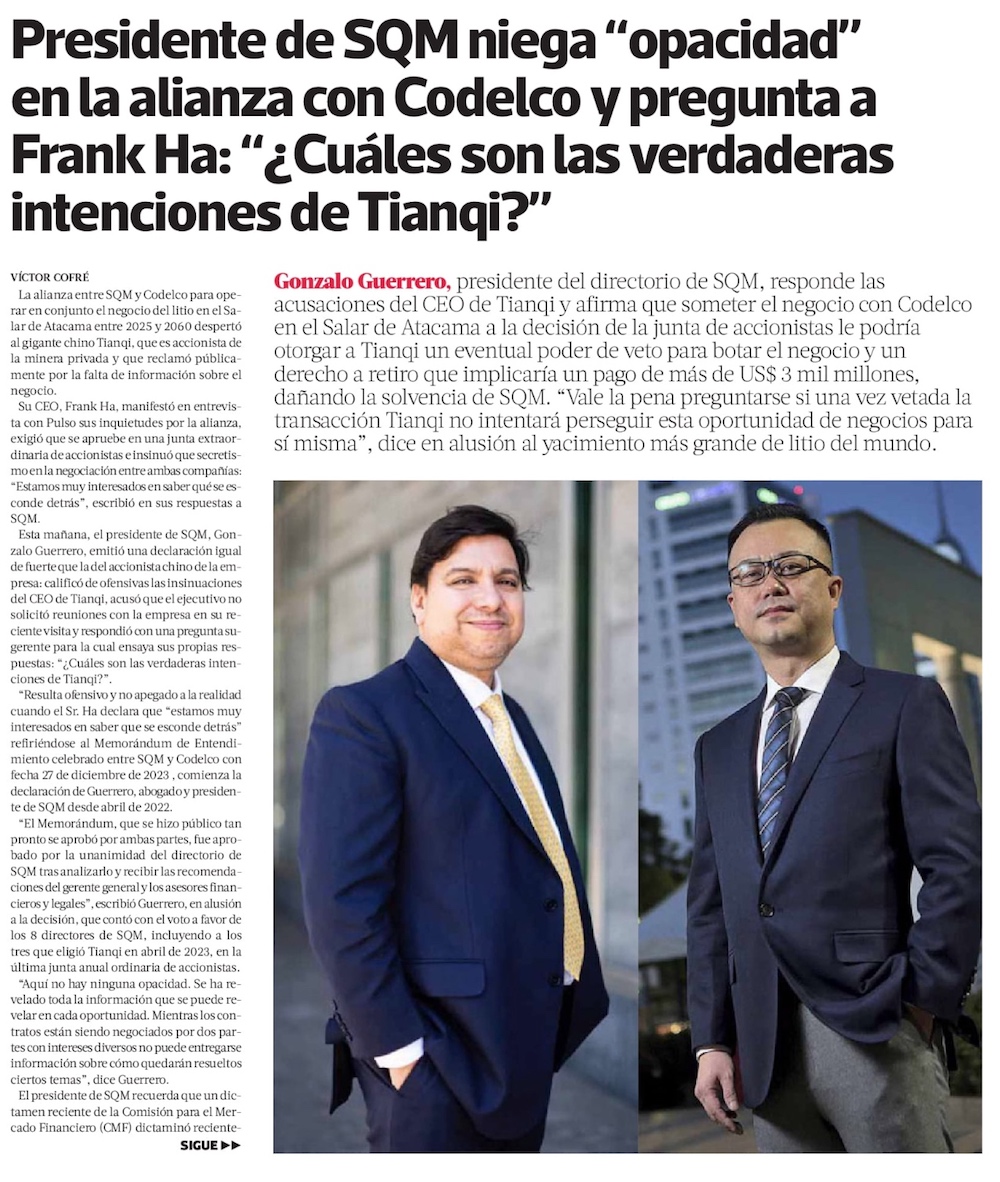 Presidente de SQM acusa a su socio Tianqi de buscar bloquear acuerdo con Codelco - (La Segunda)