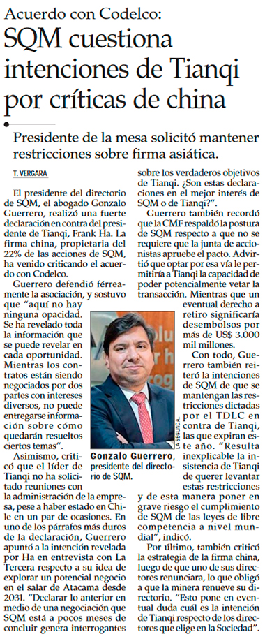 Presidente de SQM acusa a su socio Tianqi de buscar bloquear acuerdo con Codelco - (La Segunda)