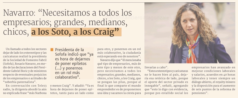 Navarro por palabras de Boric: "Necesitamos a todos los empresarios. Grandes, medianos, chicos. A los Soto, a los Craig" - (Pulso)