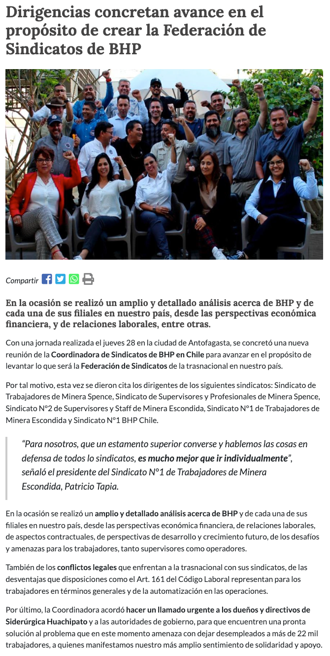 Avanza la conformación de la Federación de Sindicatos de BHP - (regionalista.cl)