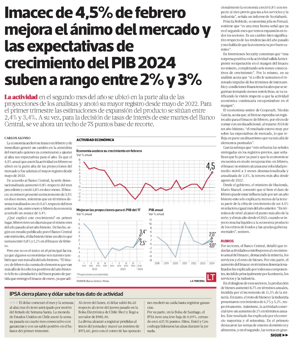 En dispar desempeño de sectores, economía repunta y anota alza de 4,5% en febrero - (El Mercurio de Santiago)