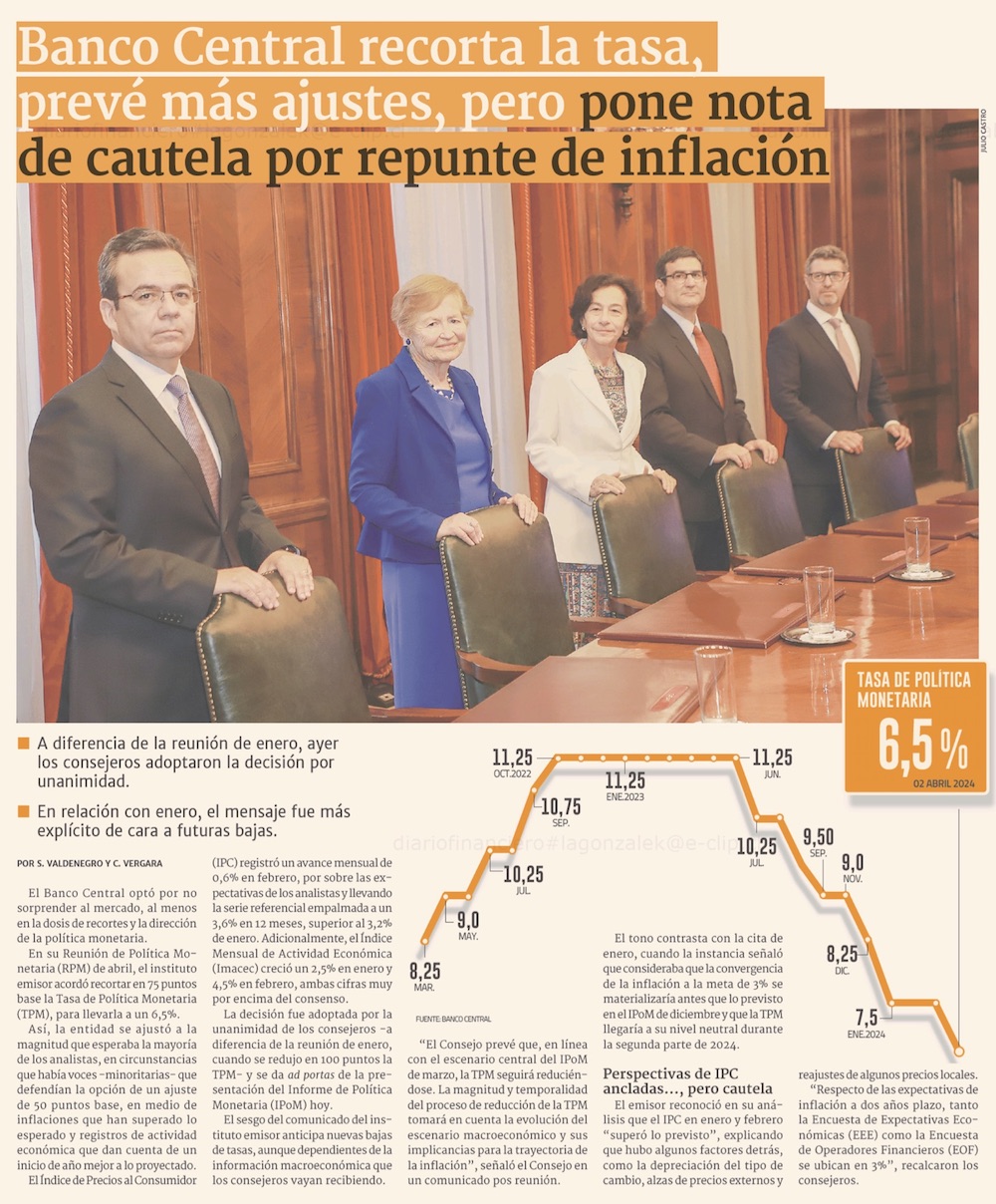 Banco Central adopta mayor cautela ante depreciación del peso y reduce ritmo de recorte de tasas a 75 pb - (El Mercurio de Santiago)