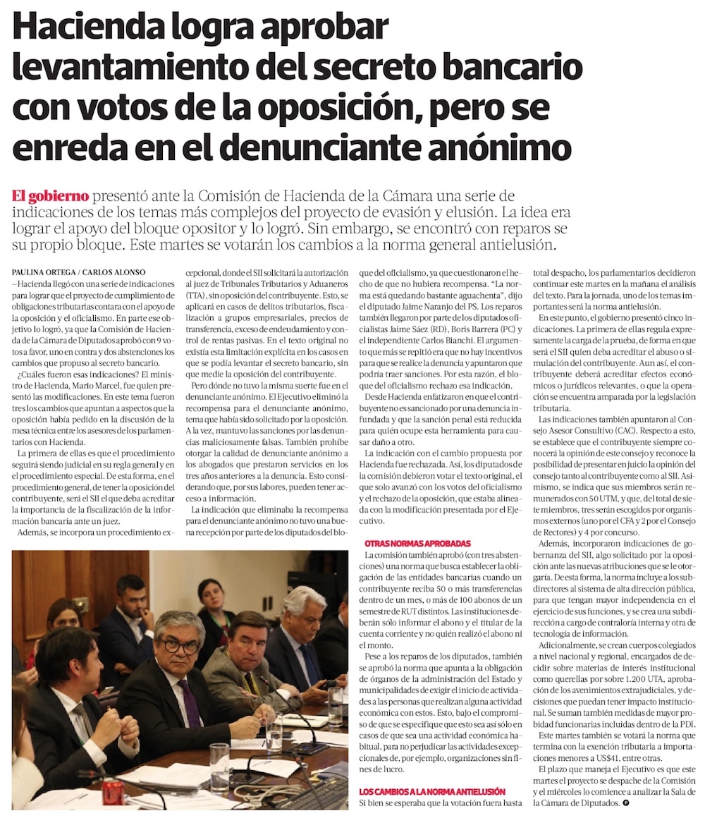 Aprueban levantamiento del secreto bancario, pero persisten dudas en norma antielusión - (El Mercurio de Santiago)