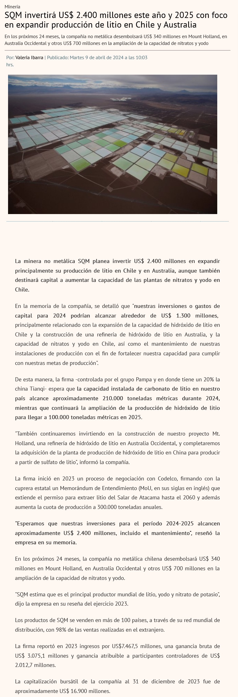 Con foco en negocio del litio, SQM invertirá US$ 2.400 millones en 2024-2025 - (El Mercurio de Santiago)