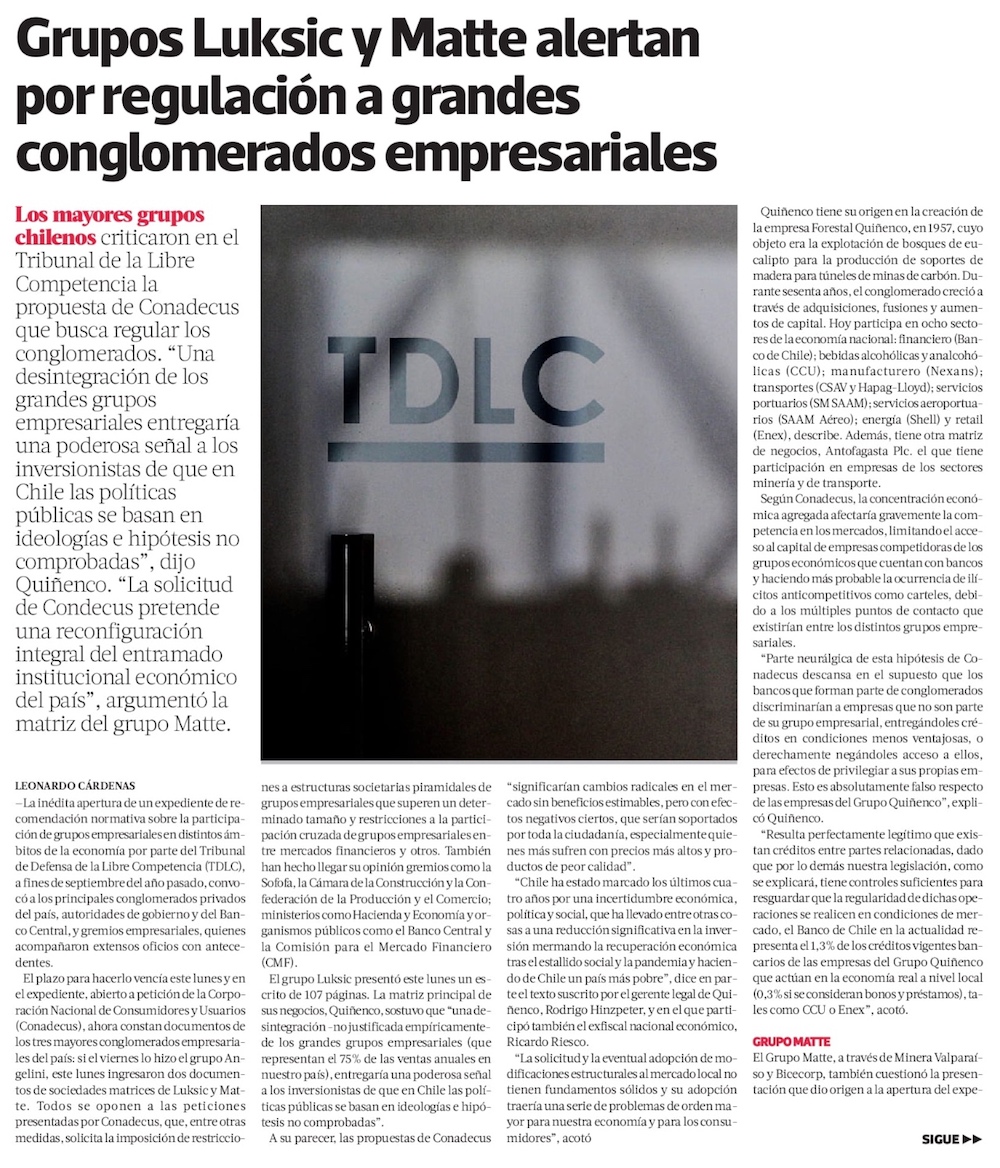 Grupo Luksic y CPC en picada contra propuesta de Conadecus de regular grupos económicos - (Diario Financiero)