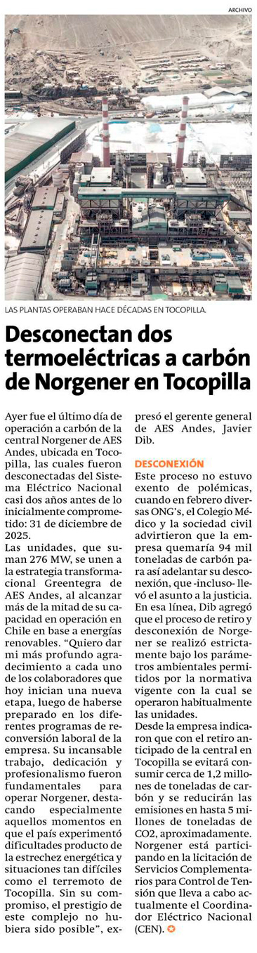 Descarbonización: este lunes se concretó el retiro de las unidades 1 y 2 de central Norgener de AES Andes en medio de polémica - (Diario Financiero)
