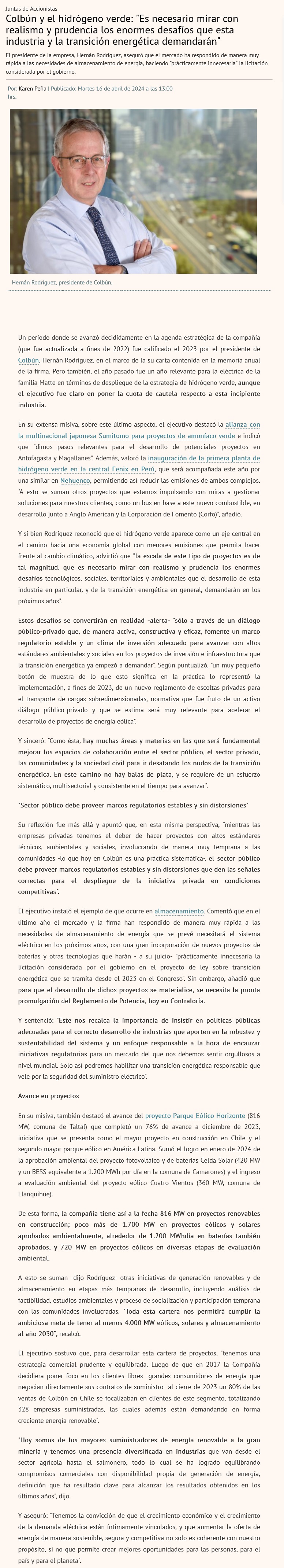 Colbún y el hidrógeno verde: “Es necesario mirar con realismo y prudencia los enormes desafíos de esta industria” - (Diario Financiero)