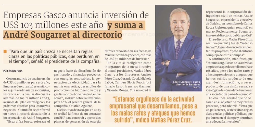 Empresas Gasco invertirá US$103 millones este año, pero critica con dureza al gobierno por estancamiento económico, trabas a inversión y seguridad - (Pulso)