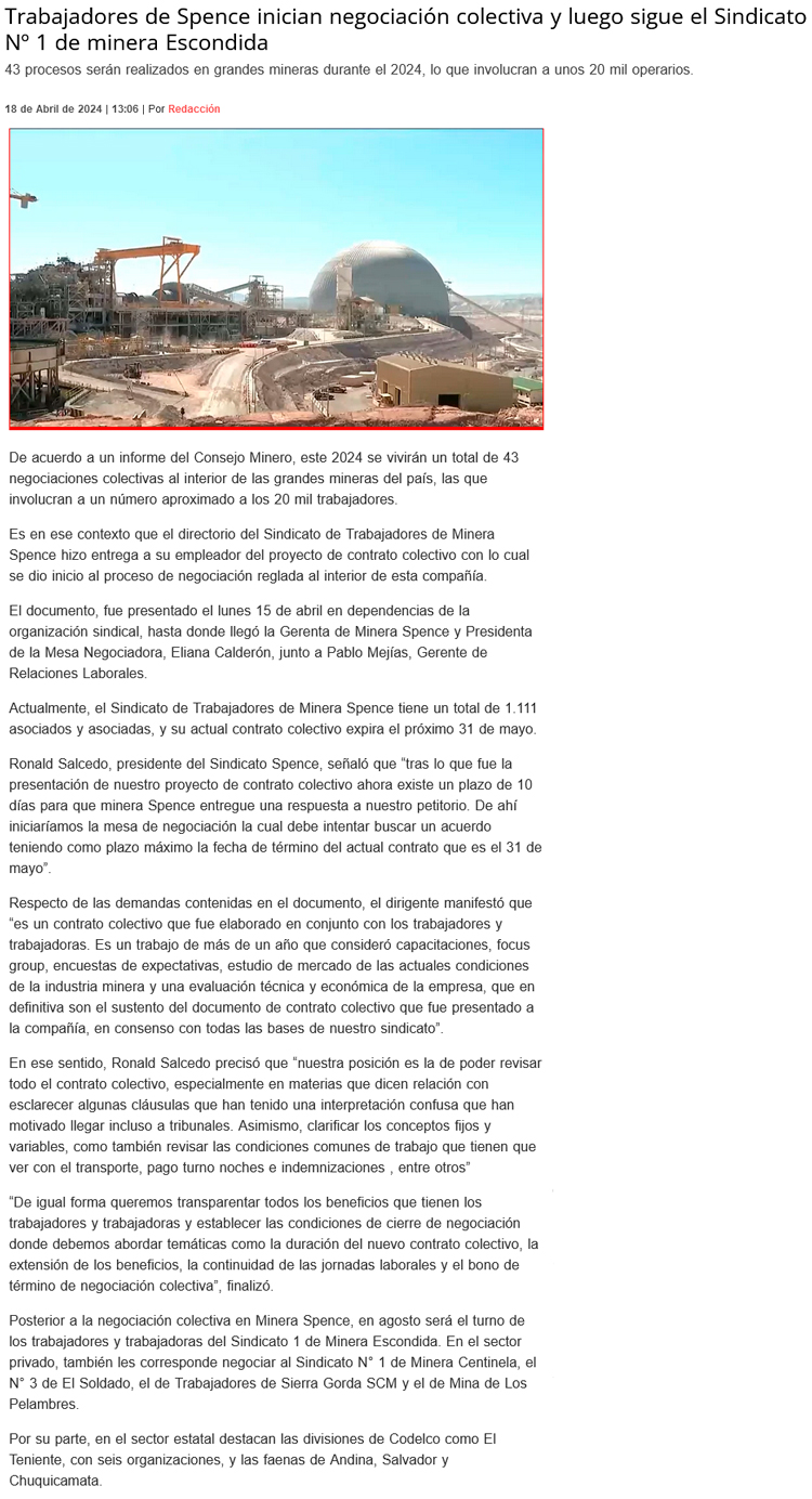Trabajadores de minera Spence iniciaron proceso de negociación colectiva - (regionalista.cl)