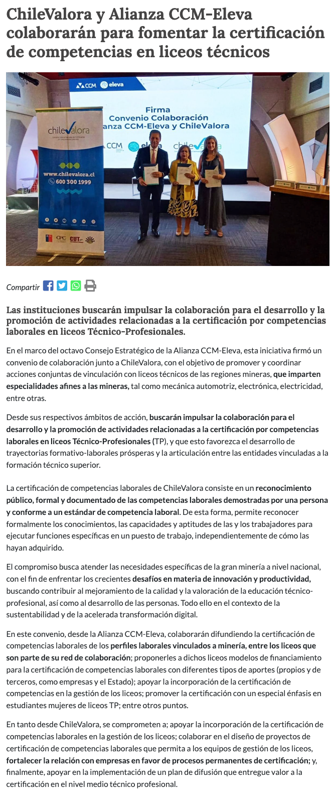 CCM-Eleva y ChileValora firman convenio para promover certificación de competencias en liceos técnicos mineros - (mch.cl)
