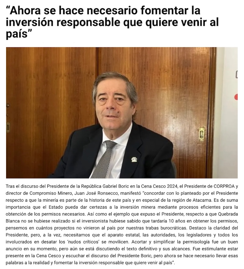 Corproa tras la cena Cesco: "Ahora se hace necesario fomentar la inversión responsable que quiere venir al país" - (El Chañarcillo)