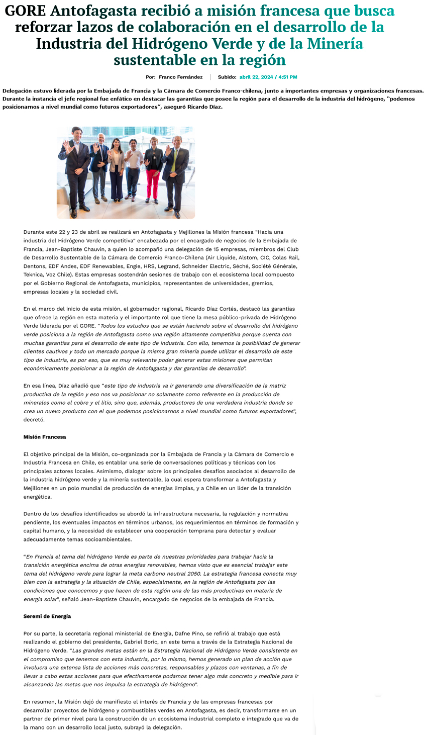 Delegación francesa visita Antofagasta por hidrógeno verde - (El Mercurio de Antofagasta)