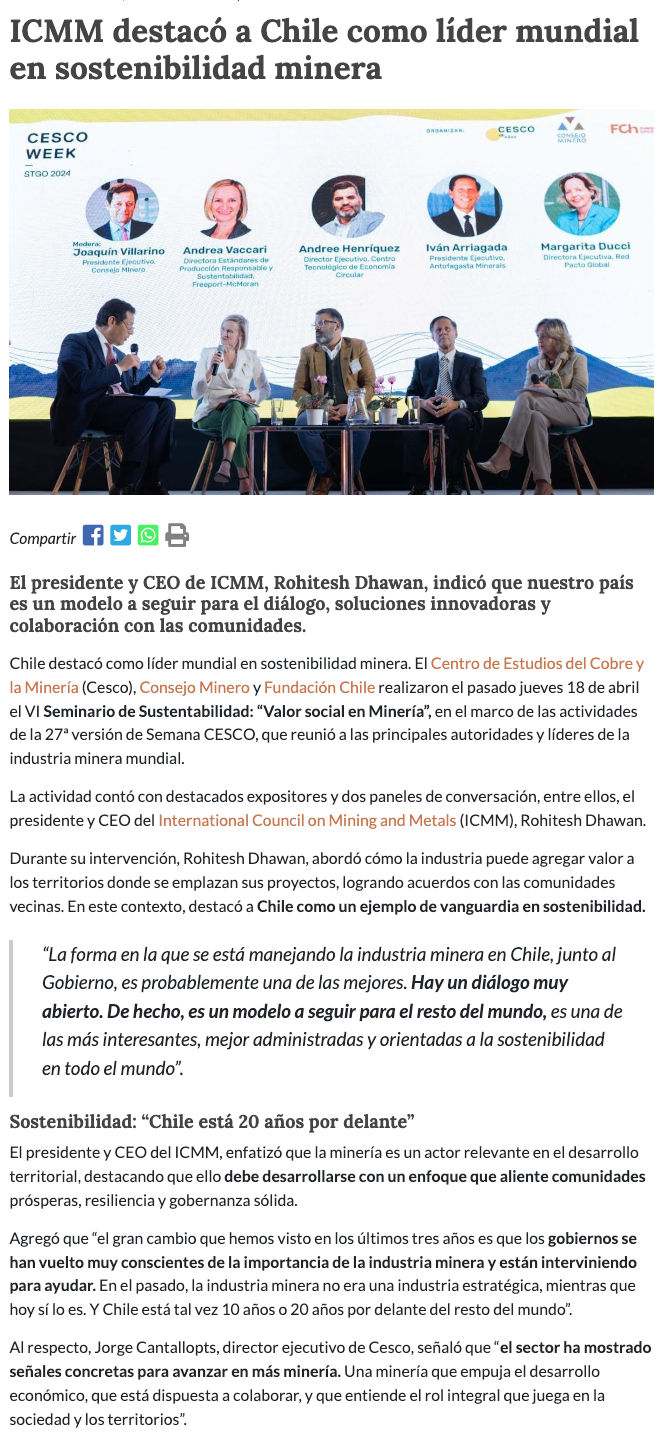 ICMM destacó a Chile como líder mundial en sostenibilidad minera - (minerialocal.cl)