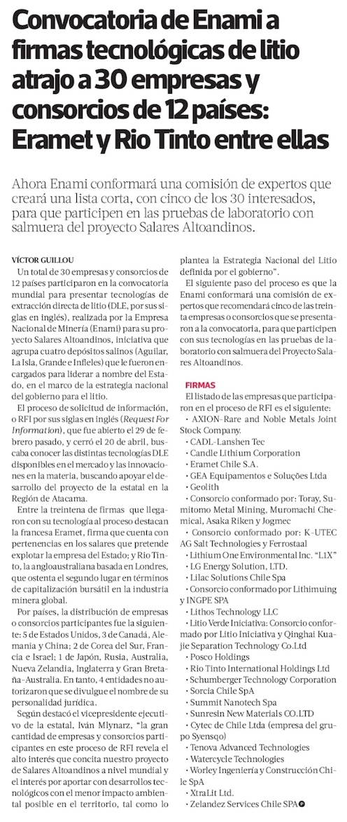 30 empresas y consorcios de 12 países presentan a Enami tecnologías para extraer litio - (Diario Financiero)