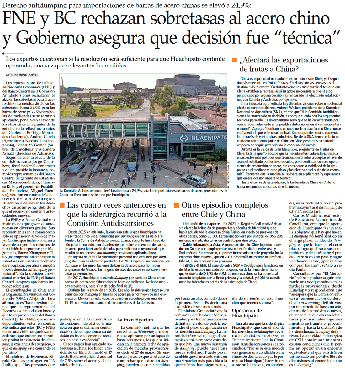 FNE y representantes del Banco Central se opusieron a sobretasas al acero chino: argumentaron falta de antecedentes sobre daño a producción nacional - (Diario Financiero)