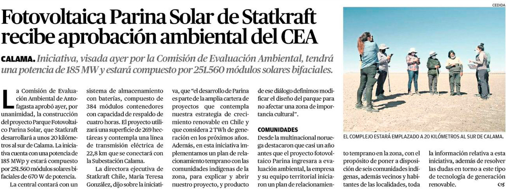 Aprueban proyecto fotovoltaico Parina Solar de Statkraft - (El Mercurio de Santiago)
