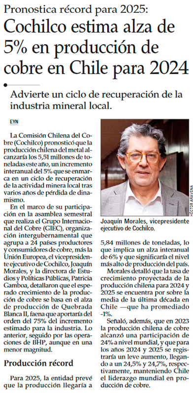 Cochilco proyecta que la producción de cobre aumentará 5% en 2024 - (El Mercurio de Antofagasta)