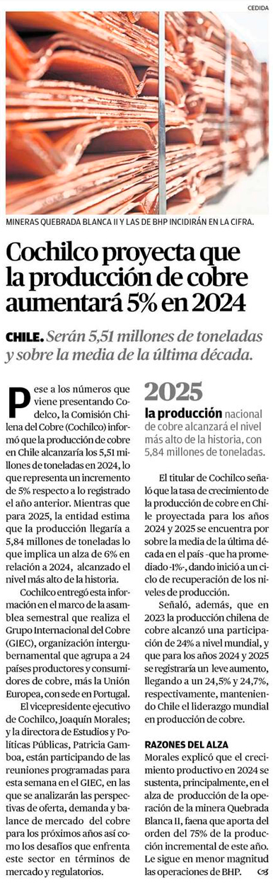 Cochilco estima alza de 5% en producción de cobre en Chile para 2024 - (El Mercurio de Santiago)