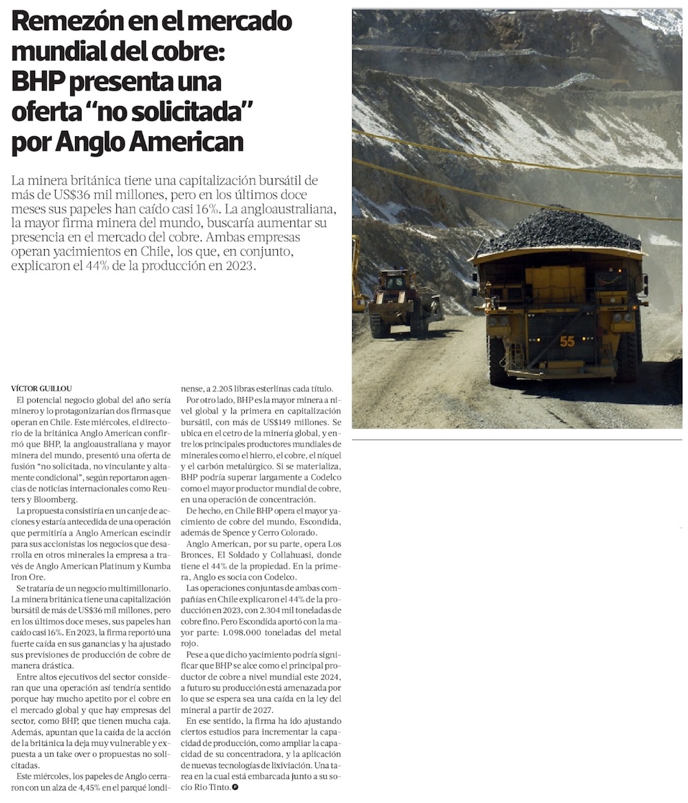 BHP propone adquisición de Anglo American en mega acuerdo minero - (Diario Financiero)