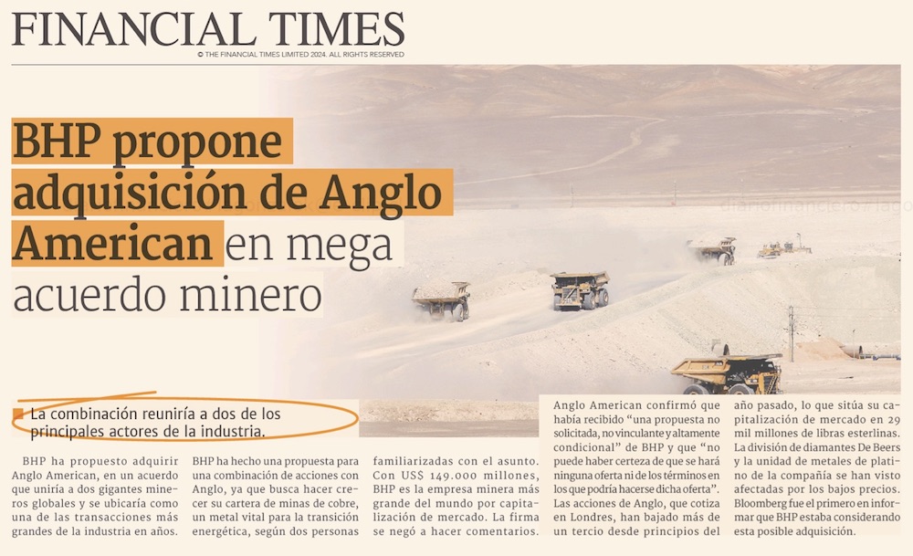 Anglo American confirma que recibió una oferta de BHP Group en el que sería uno de los mayores negocios del año - (DF Online)