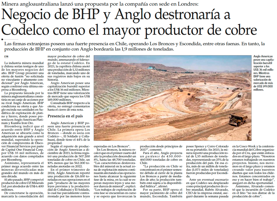 BHP propone adquisición de Anglo American en mega acuerdo minero - (Diario Financiero)