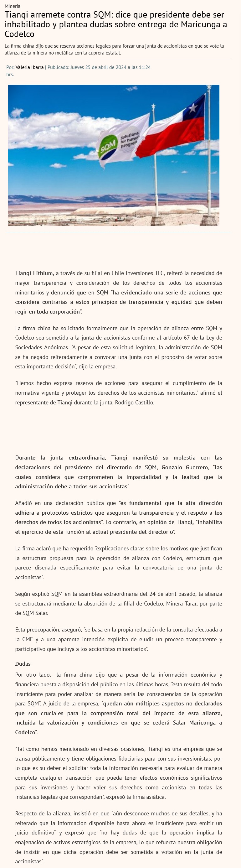 Tianqi arremete contra SQM: critica al presidente del directorio y plantea dudas sobre entrega de Maricunga a Codelco - (Diario Financiero)