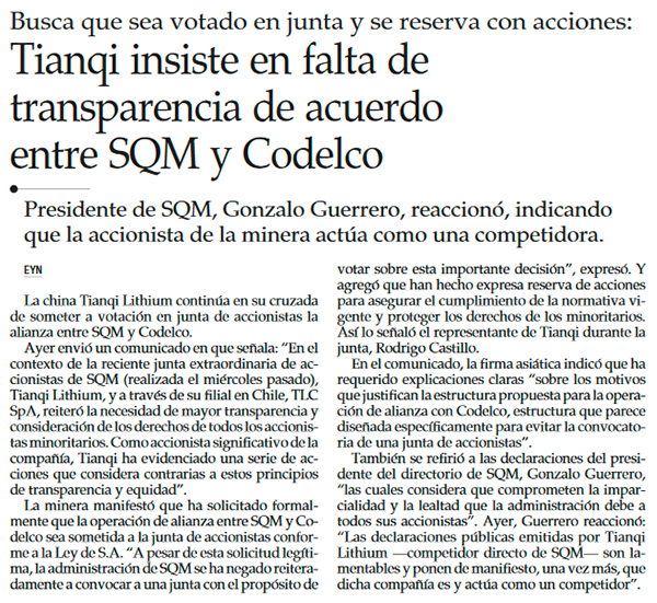 Tianqi arremete contra SQM: critica al presidente del directorio y plantea dudas sobre entrega de Maricunga a Codelco - (Diario Financiero)