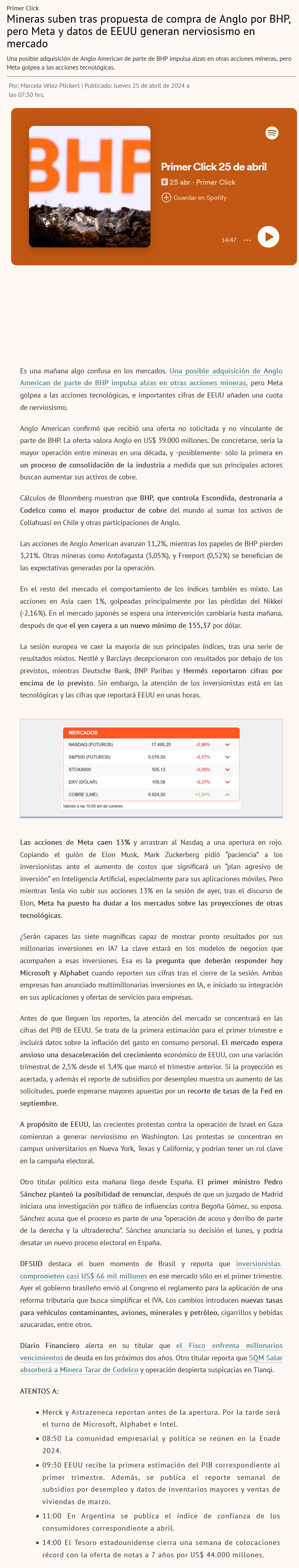 Acciones de Anglo American saltan 16% tras oferta de BHP por la compañía - (Diario Financiero)