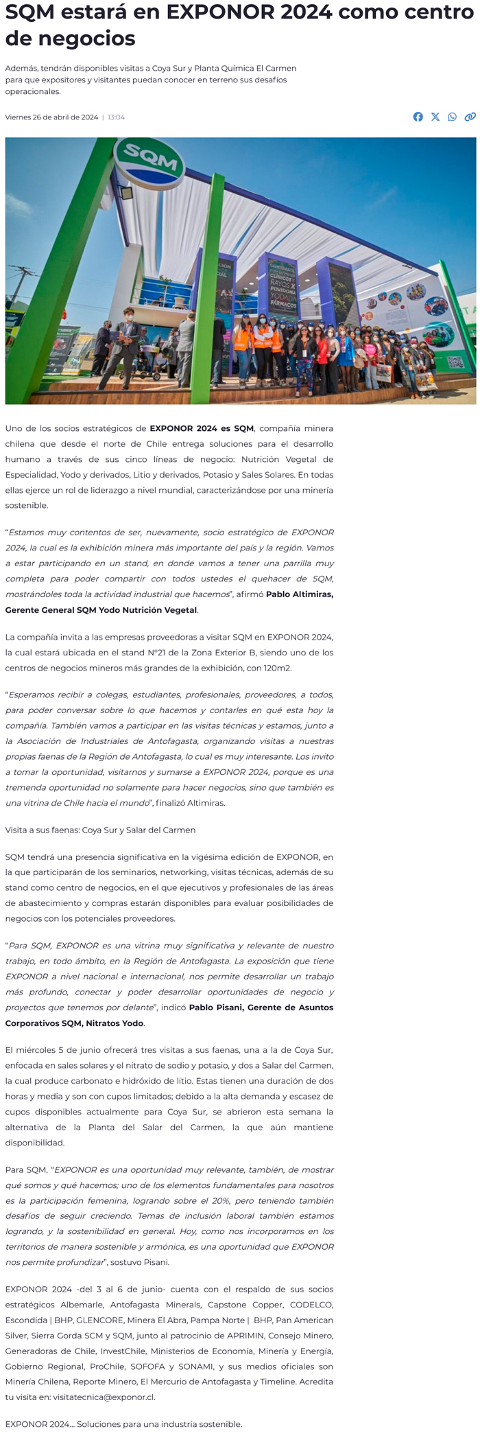 SQM estará como Centro de Negocios en EXPONOR 2024 - (madero.cl)