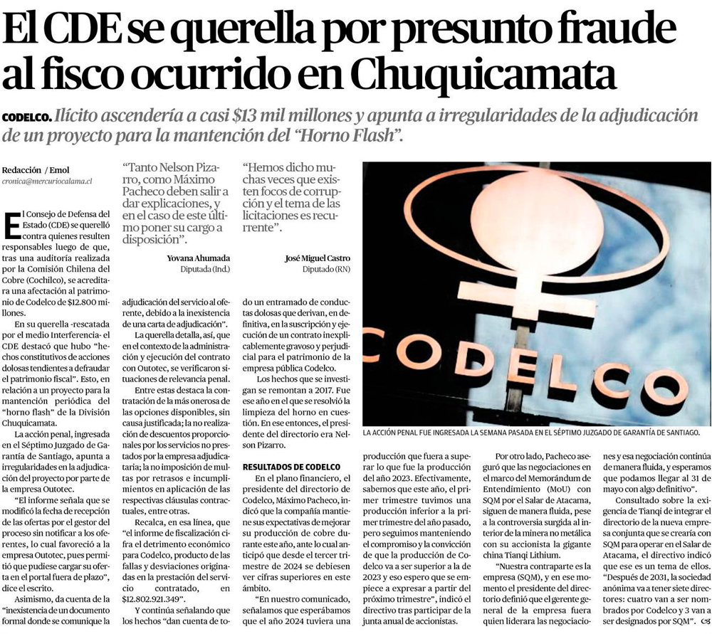 CDE se querella por millonario fraude en Codelco - (La Segunda)