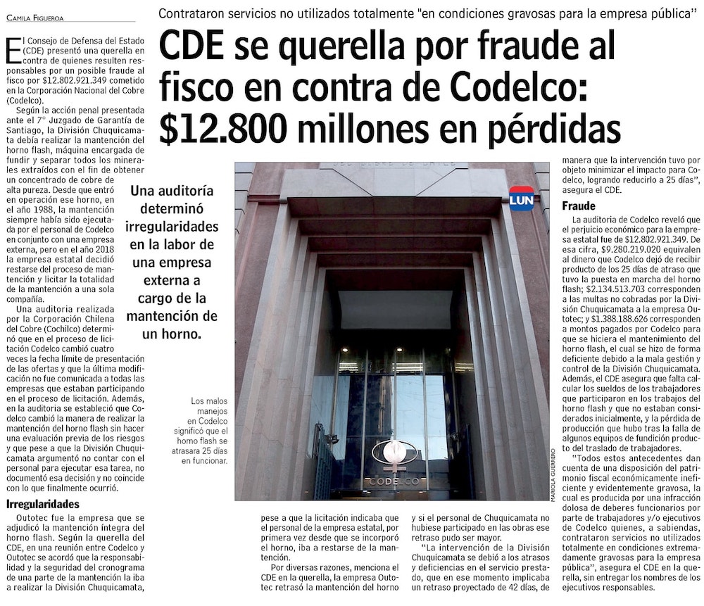 El CDE se querella por presunto fraude al fisco ocurrido en Chuquicamata - (El Mercurio de Antofagasta)