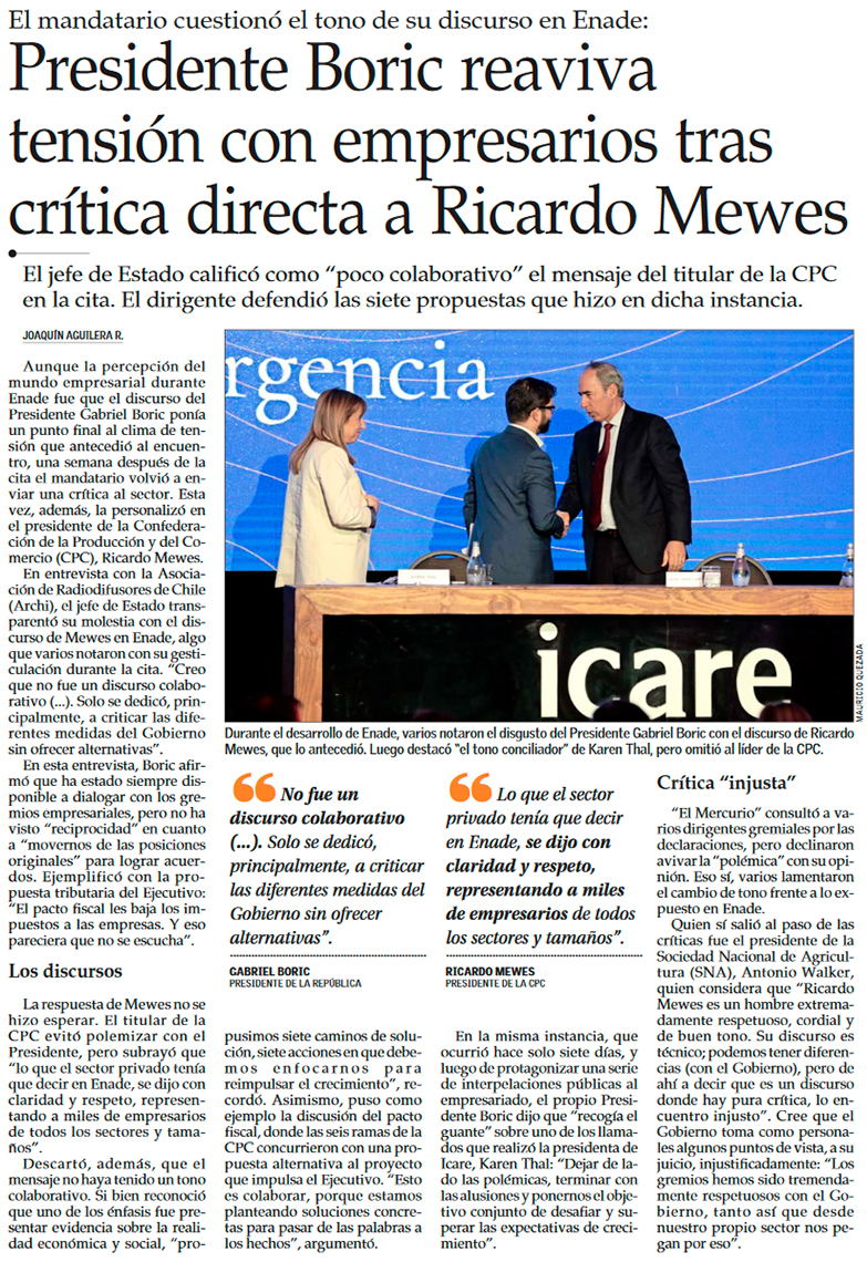 Boric arremete contra Mewes por discurso en Enade y líder empresarial declina polemizar - (Diario Financiero)