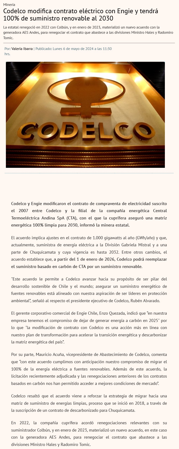 Codelco asegura 100% de suministro de energía renovable para 2030 - (La Segunda)