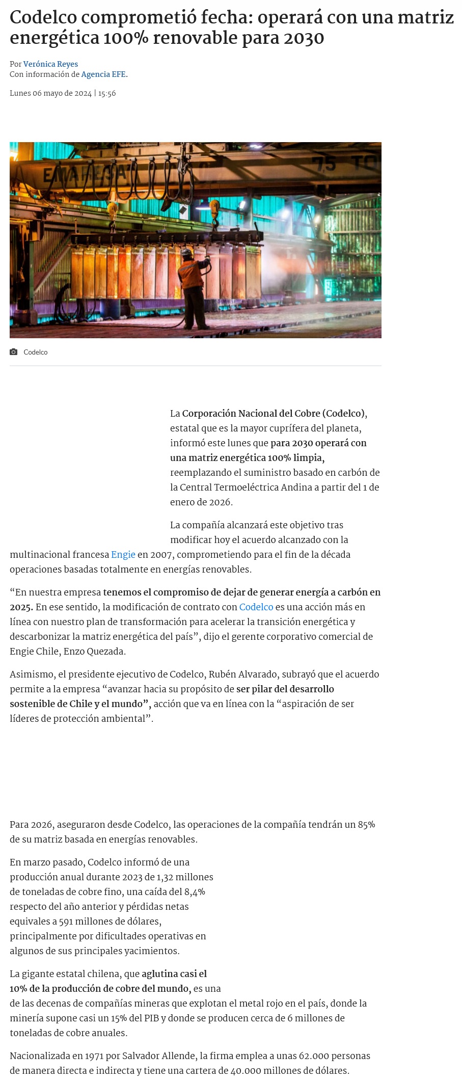 Codelco modifica contrato eléctrico con Engie y tendrá 100% de suministro renovable al 2030 - (DF Online)