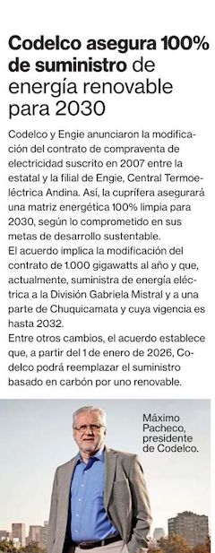 Codelco modifica contrato eléctrico con Engie y tendrá 100% de suministro renovable al 2030 - (DF Online)