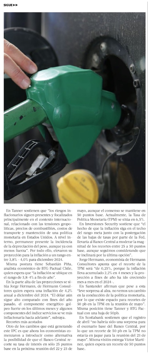 Tras IPC de abril, se afianza en el mercado pronóstico de inflación cerca de 4% a diciembre y de una próxima baja de tasas de 50 puntos - (Diario Financiero)