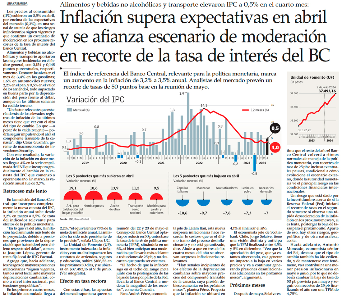 Tras IPC de abril, se afianza en el mercado pronóstico de inflación cerca de 4% a diciembre y de una próxima baja de tasas de 50 puntos - (Diario Financiero)