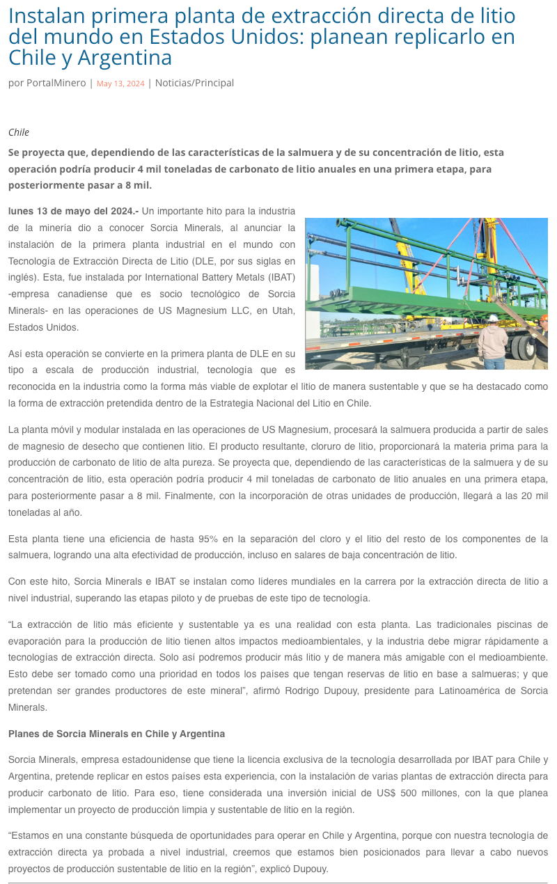 Instalan primera planta de extracción directa de litio del mundo en Estados Unidos: compañía planea replicarlo en Chile y Argentina - (Estrategia)