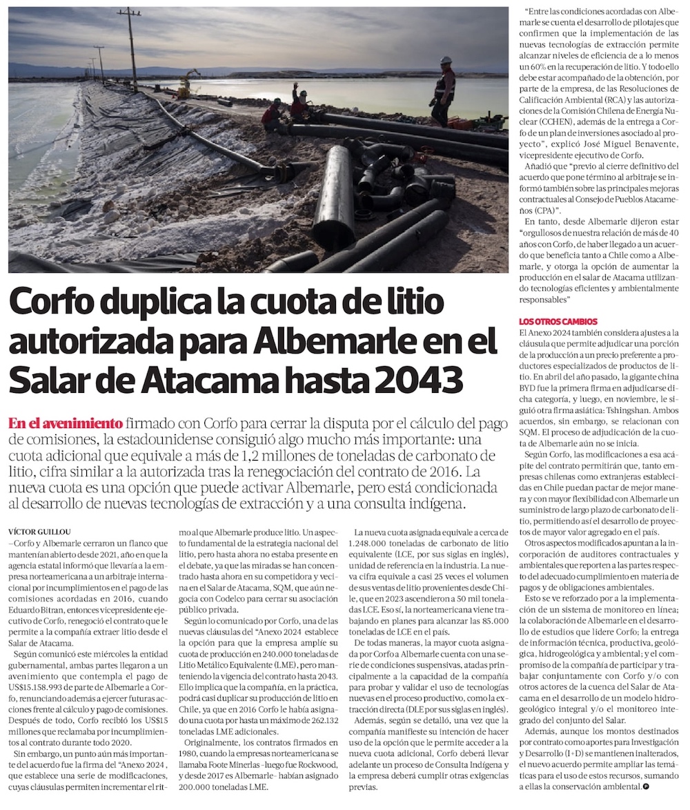 Corfo y Albemarle resuelven amistosamente el juicio arbitral que mantenían desde el 2021 - (El Mercurio de Antofagasta)