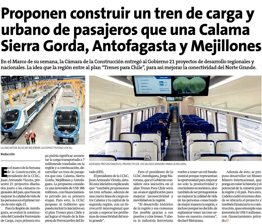 CChC propone tren de pasajeros para unir Calama, Sierra Gorda, Mejillones y Antofagasta - (El Mercurio de Antofagasta)
