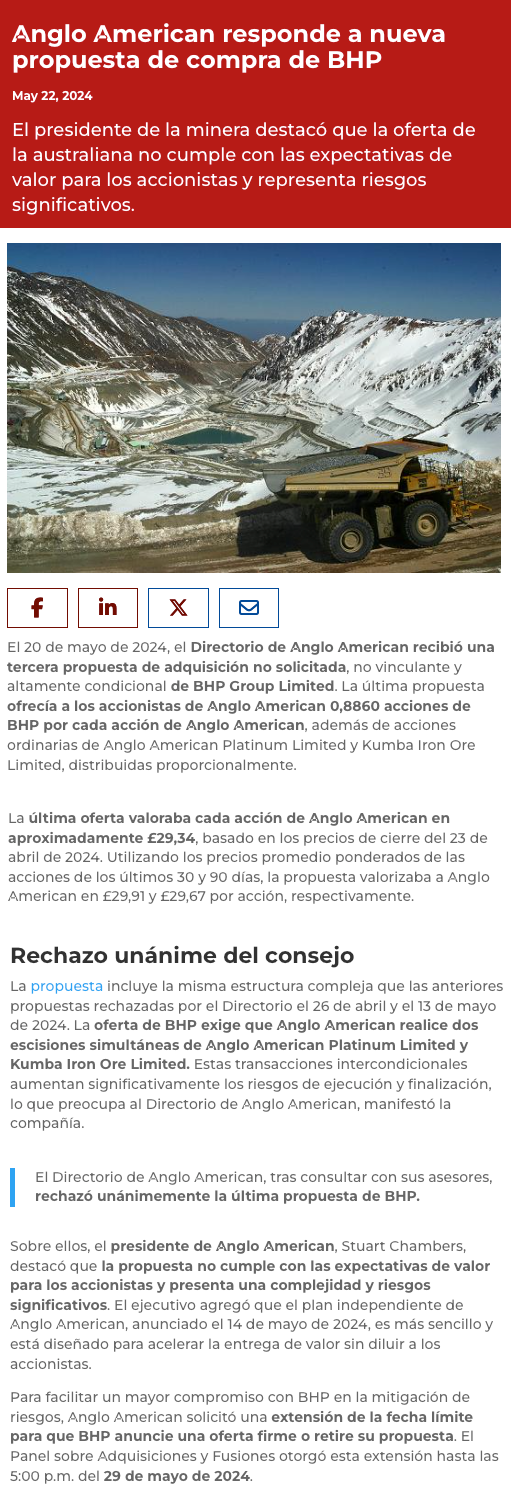 Anglo American rechaza nueva oferta de BHP que la valorizaba en más de US$49.000 millones, pero da más plazo para negociar - (Pulso)