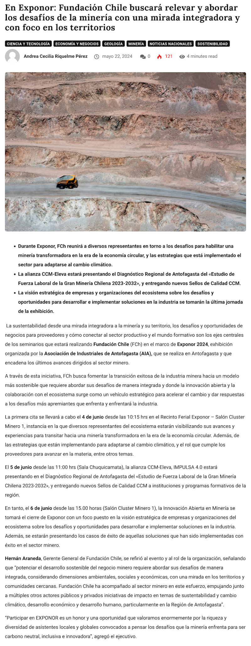 En Exponor 2024 Fundación Chile buscará relevar y abordar los desafíos de la minería con una mirada integradora y con foco en los territorios - (mvcomunicaciones.cl)