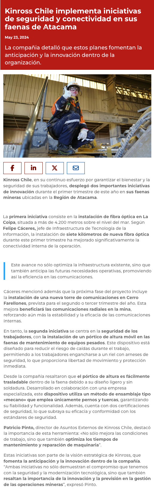 Con foco en la seguridad y la innovación: Kinross Chile incorpora nuevas tecnologías a su faena minera en 2024 - (tierramarillano.cl)