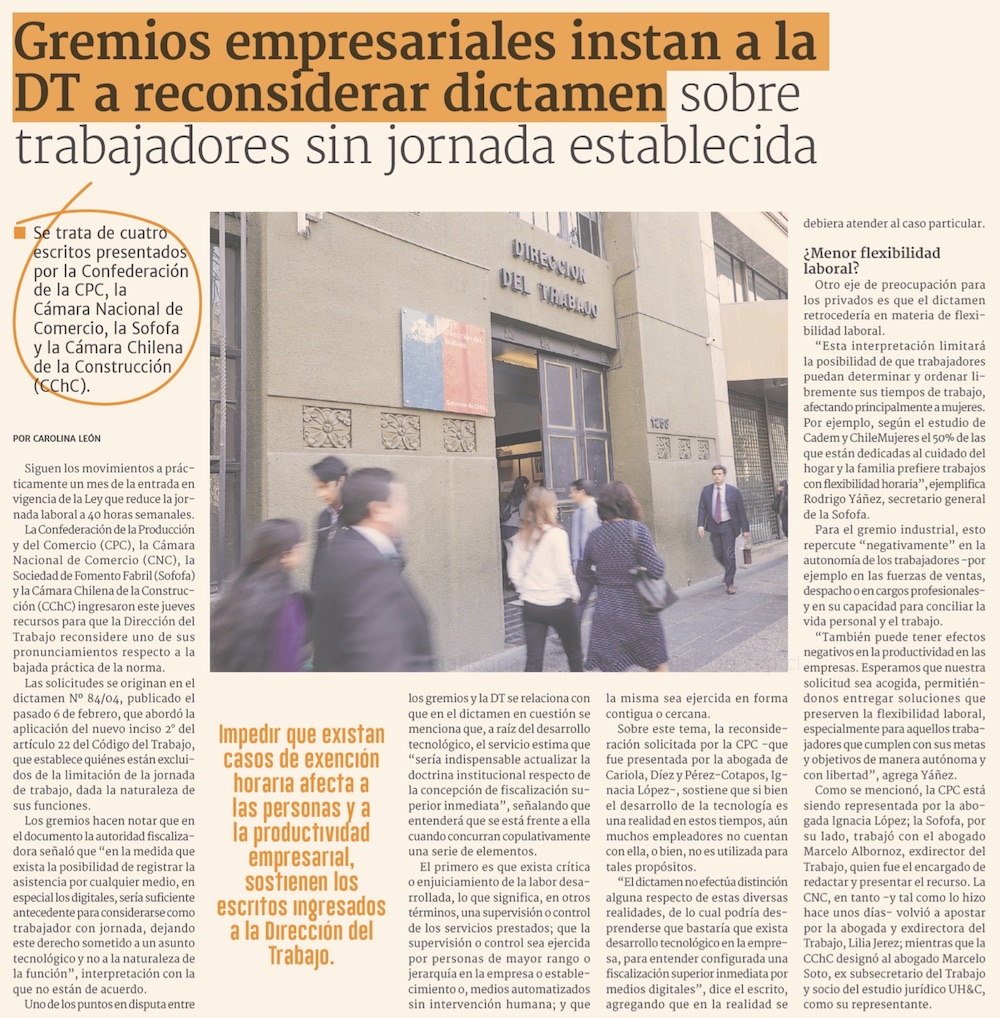 Gremios empresariales piden reconsiderar criterios de la DT sobre exclusión de jornada - (El Mercurio de Santiago)