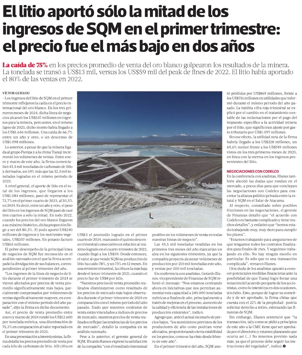 Efecto contable y menor precio del litio explican las pérdidas económicas reportadas por SQM - (El Mercurio de Santiago)