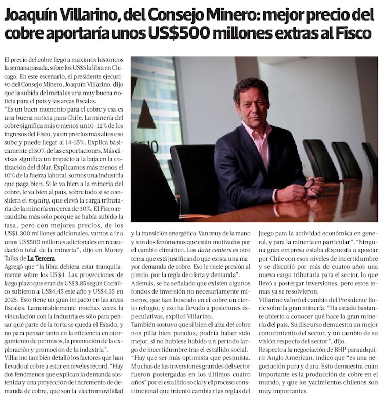 Joaquín Villarino, presidente del Consejo Minero: “Muchas veces la vinculación con la industria es solo para pensar qué parte de la torta se queda el Estado” - (La Tercera Online)