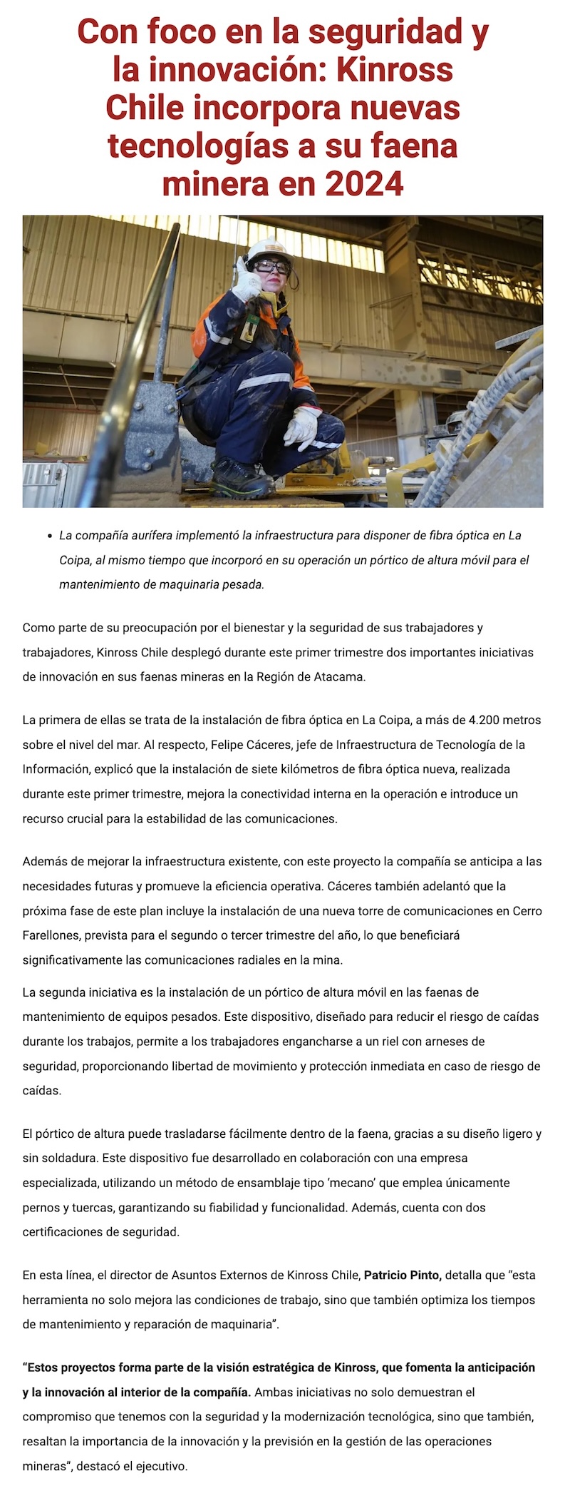 Kinross Chile implementa iniciativas de seguridad y conectividad en sus faenas de Atacama - (mch.cl)
